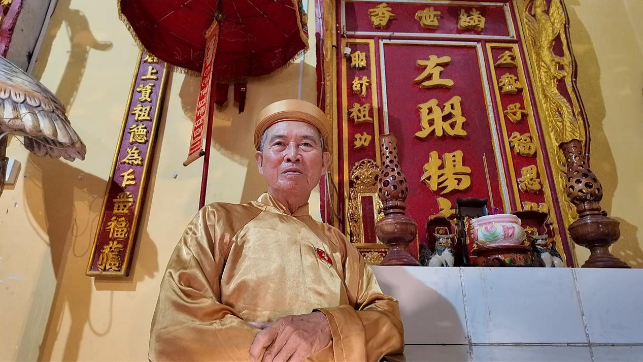 Ông Dương Hồng Hưng bên linh vị thờ Tiền hiền Dương Văn Hóa